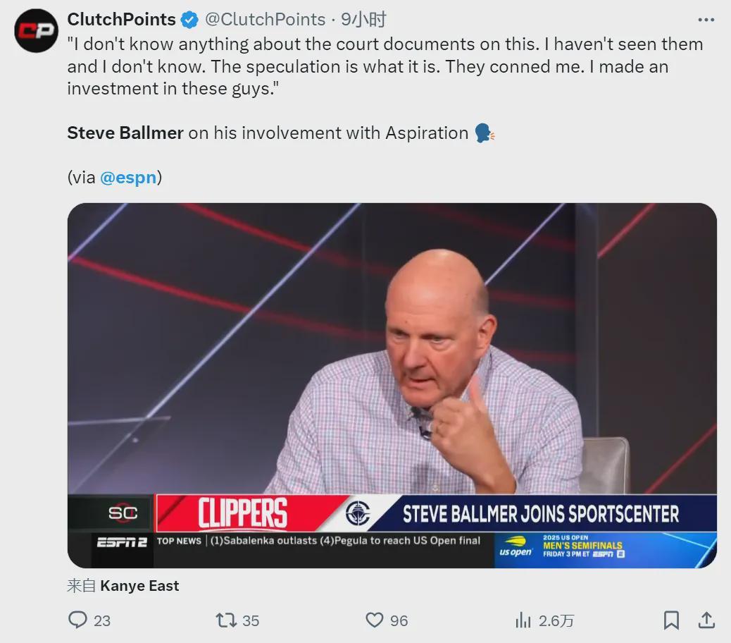 NBA官方已经正式启动调查程序,鲍尔默现身ESPN节目,对此事进行澄清:“这是伦纳德在Aspiration公司的私事,所以我不会打听。我在Aspiration公司只拥有不到3%的股份,我既没有董事会席位,也没有任何控制权。”